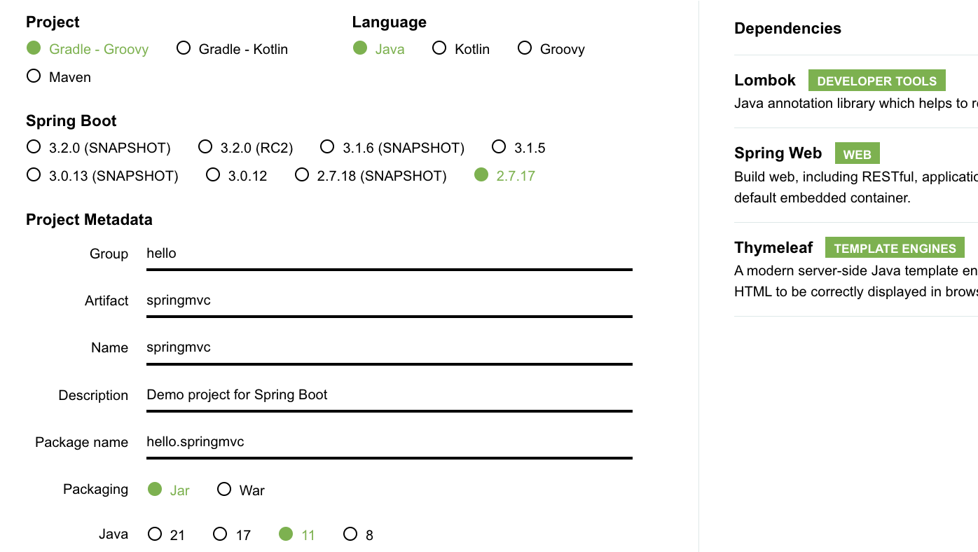 https://start.spring.io 클릭 → 아래와 같이 설정 → 나머지는 강의를 참고해주세요