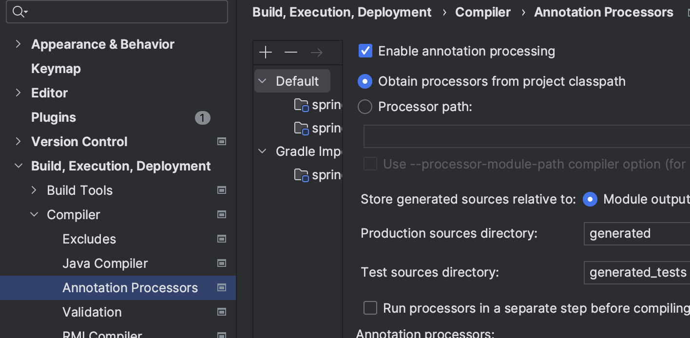 command + , → [ Build, Execution, Deployment - Compiler - Annotation Processors ] 에서 Enable annotation processing 체크