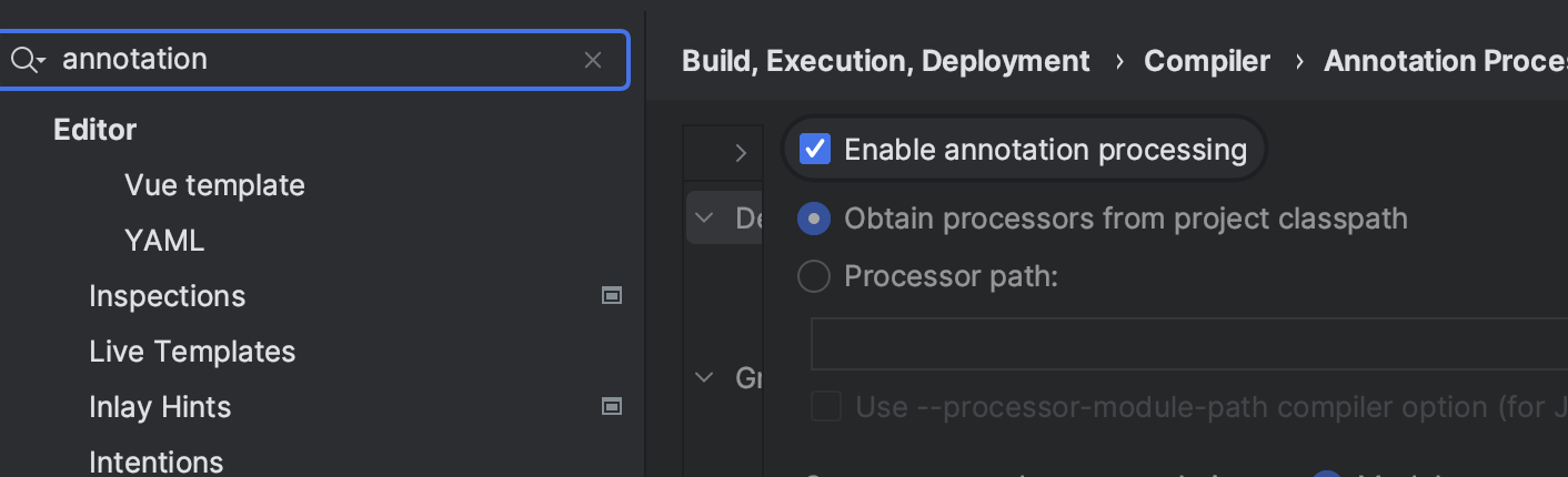 command + ; 클릭 → annotation 검색 후 Enable annotation processing 체크