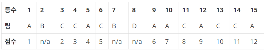 - 팀 점수 = 상위 4명의 주자의 점수를 합하여 계산 (결승점을 통과한 순서대로 점수를 받기)