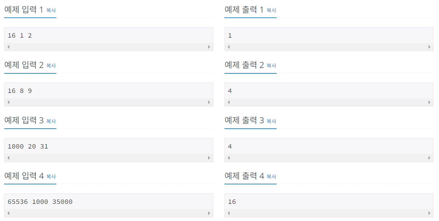 : 첫째 줄에 참가자 수 N, 김지민과 임한수의 번호 입력 ( 2 ≤ N ≤ 100,000 자연수 )