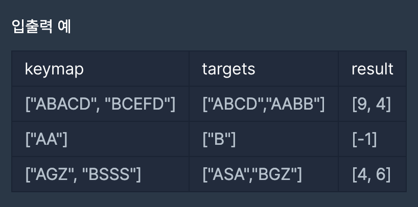 public int[] solution(String[] keymap, String[] targets) {