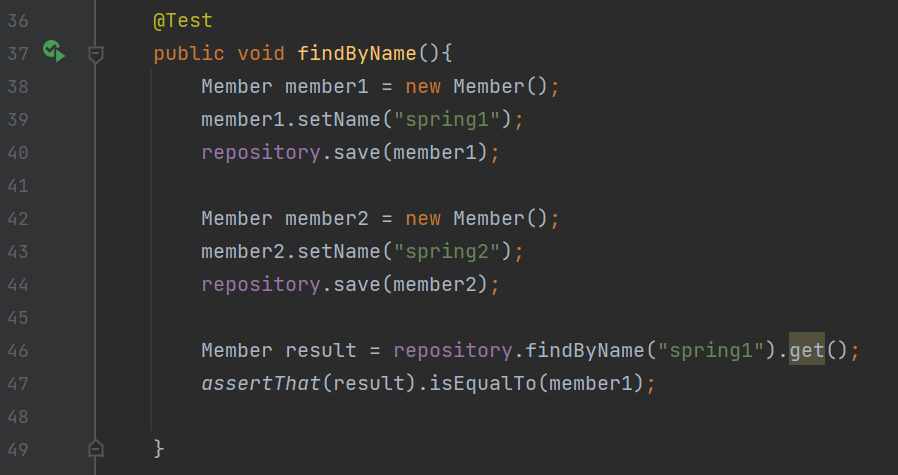 ☞ assertThat(result).isEqualTo(meber1) : result가 spring1이고spring1은 member1 이므로 테스트 성공