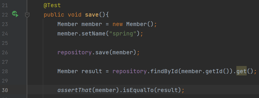 Assertion.assertThat(member).isEqualTo(result) 입력 후run하면 글자가 아닌 녹색 표시로 결과 표현