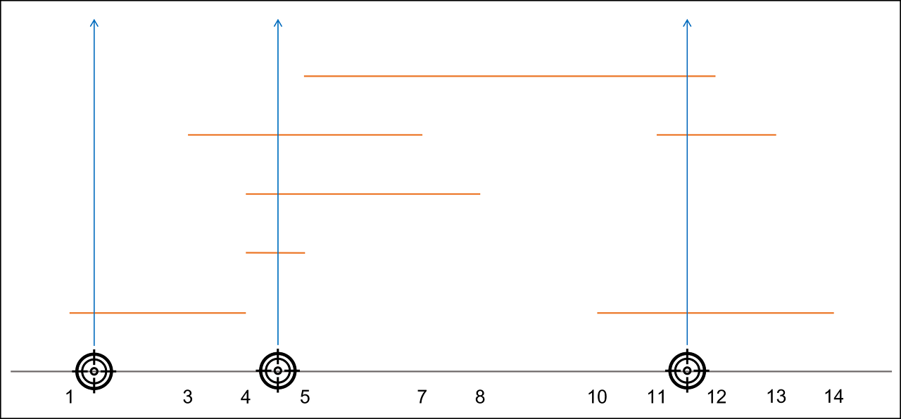 1 2 3 4 5 다음 타겟 [4,5]의 시작지점 4를 보고 더 이상 겹치는 것이 없음을 확인