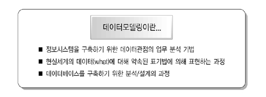 - 모델링의 세 가지 관점: 데이터관점, 프로세스관점, 데이터와 프로세스의 상관관점으로 구분