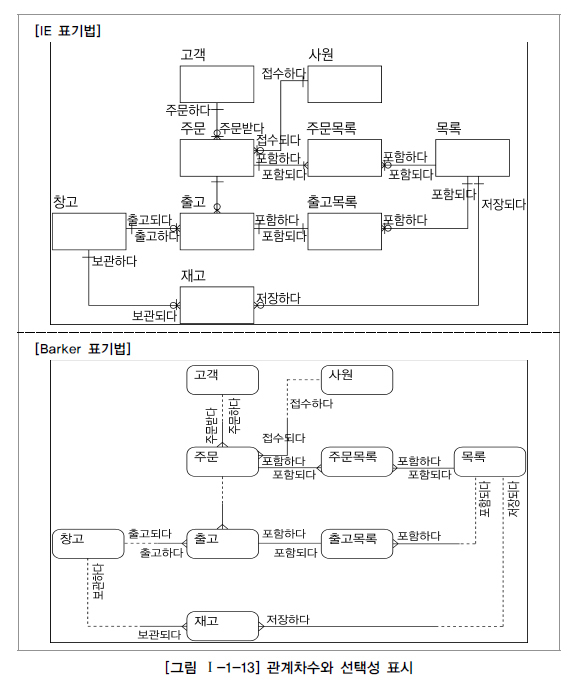 4) IE표기는 1:1의 관계는 실선으로 표기 Barker 표기는 점선과 실선으로 표기